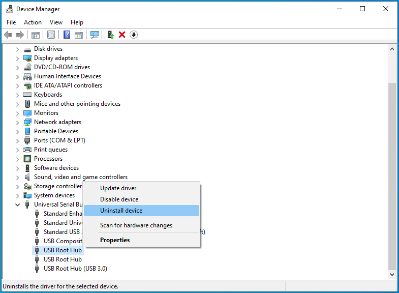 - Right-click USB Root Hub and select "Uninstall device".