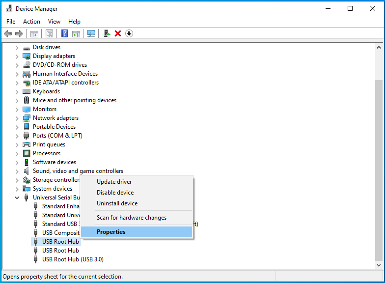 - Yous will find at least 1 USB Root Hub under Universal Serial Bus Controllers. Right-click information technology and select Properties.